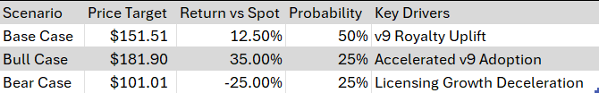 Bull Case target of $181.90 suggests a significant +35.0% upside, contingent on accelerated adoption of high-royalty v9 designs.