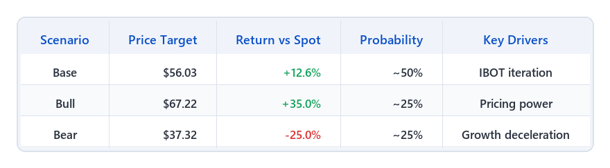 Our Base Case target is $56.03 (56.6x P/E), reflecting a re-rating as earnings recover. Our Bull Case target is $67.22 (67.9x), assuming sustained pricing power and IBOT acceptance. Our Bear Case target is $37.32 (37.7x). In a tech sector de-rating, we would prioritize holding core exposure and adjusting sizing, rather than exiting purely on multiple compression.