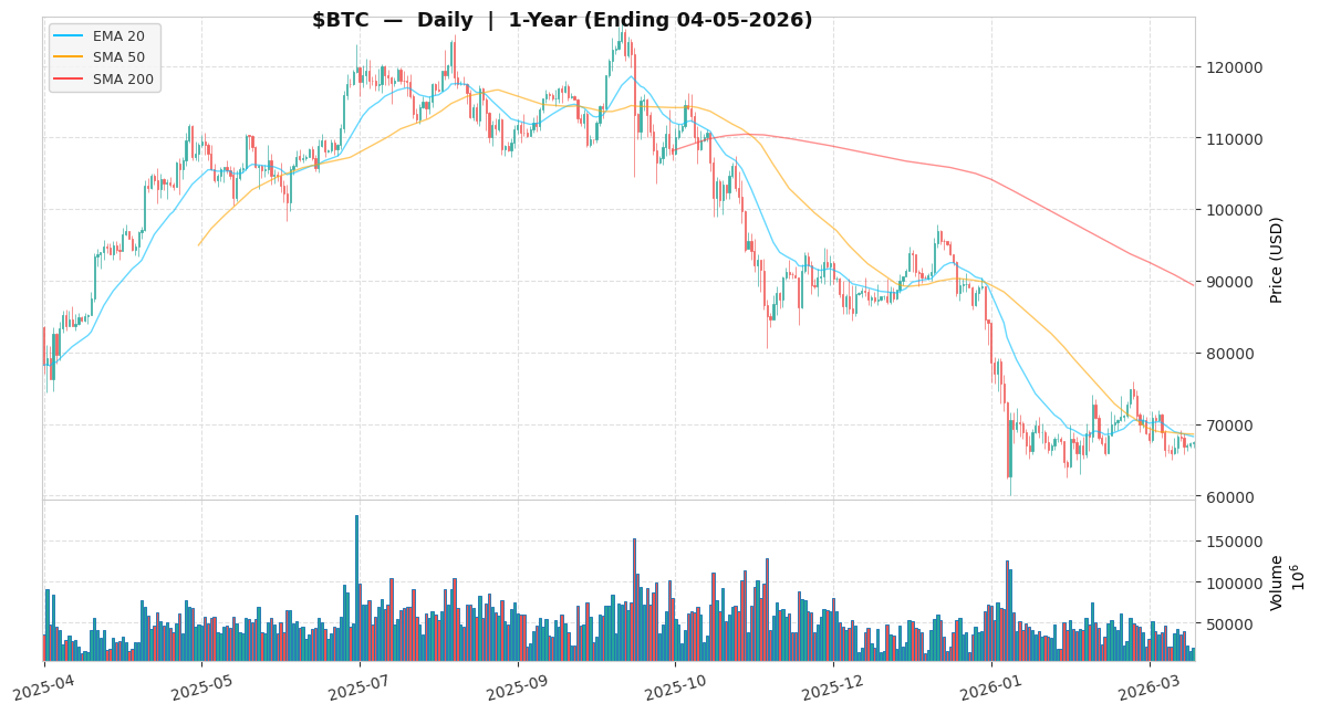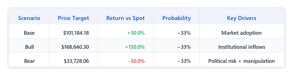 Scenario-Based Price Targets (Equally Weighted at 33% Probability): * 🐂 Bull Case (+150.0%): $168,640.30 — Unlocked by broader institutional adoption and macro liquidity tailwinds. * ⚖️ Base Case (+50.0%): $101,184.18 — Target from the current market price of $67,456.12 as of 2026-04-05. * 🐻 Bear Case (-50.0%): $33,728.06 — Triggered by a sustained spike in exchange inflows (>$1B net inflows over 7 days signaling distribution) AND escalation of geopolitical tensions involving state actors actively manipulating markets, or US real yields rising >2.5%.